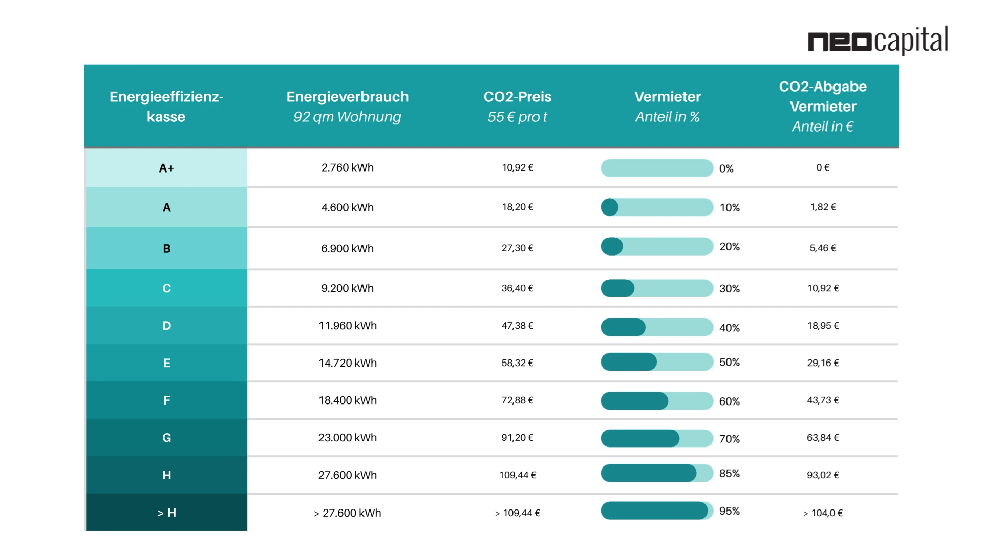 Das CO₂-Kostenaufteilungsgesetz ordnet Gebäude in Effizienzklassen von A+ bis H. Je höher der Verbrauch, desto größer der Vermieteranteil. In hocheffizienten Gebäuden (Klasse A+ oder A) tragen Mieter nahezu die gesamte CO₂-Abgabe selbst. Steigt der Verbrauch jedoch in die Klassen E, F, G oder H, erhöht sich der Vermieteranteil erheblich. In schlechten Effizienzklassen kann der Vermieter bis zu 95 % der CO₂-Kosten tragen. Dadurch entsteht ein spürbarer Renditeverlust, insbesondere bei größeren Wohnungsbeständen.