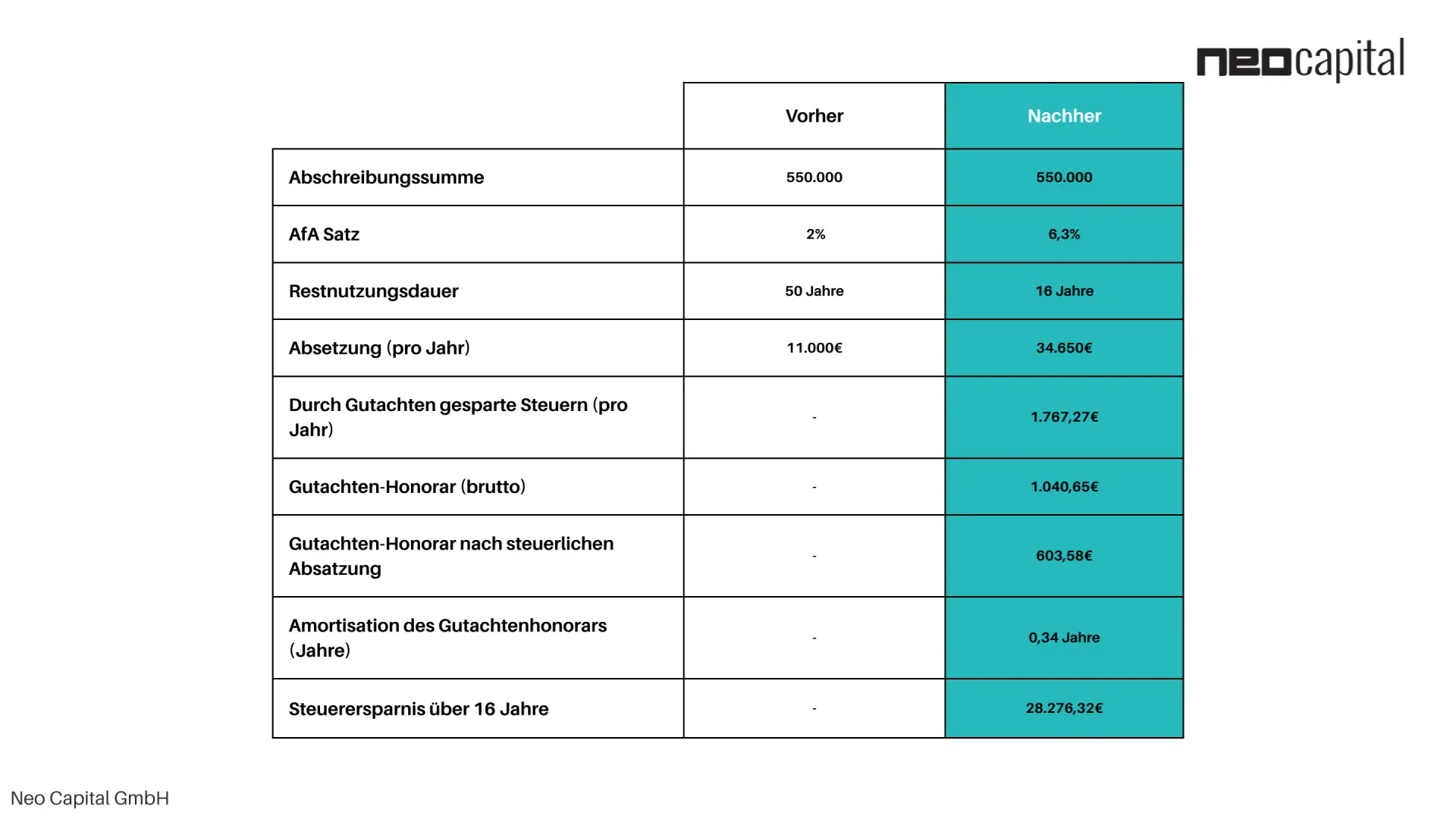 Die steuerliche Auswirkung ist enorm: Wird eine Restnutzungsdauer von z. B. 25 Jahren festgestellt, verdoppelt sich die AfA automatisch von 2 % auf 4 %. Bei einer Restnutzungsdauer von 20 Jahren liegt die AfA bereits bei 5 %. Dadurch lassen sich jedes Jahr mehrere tausend Euro steuerpflichtiger Gewinn reduzieren. Anlegern verschafft dies einen sofortigen Liquiditätsvorteil und eine spürbare Renditesteigerung, ohne bauliche Maßnahmen, allein durch präzise Dokumentation des Ist-Zustands.